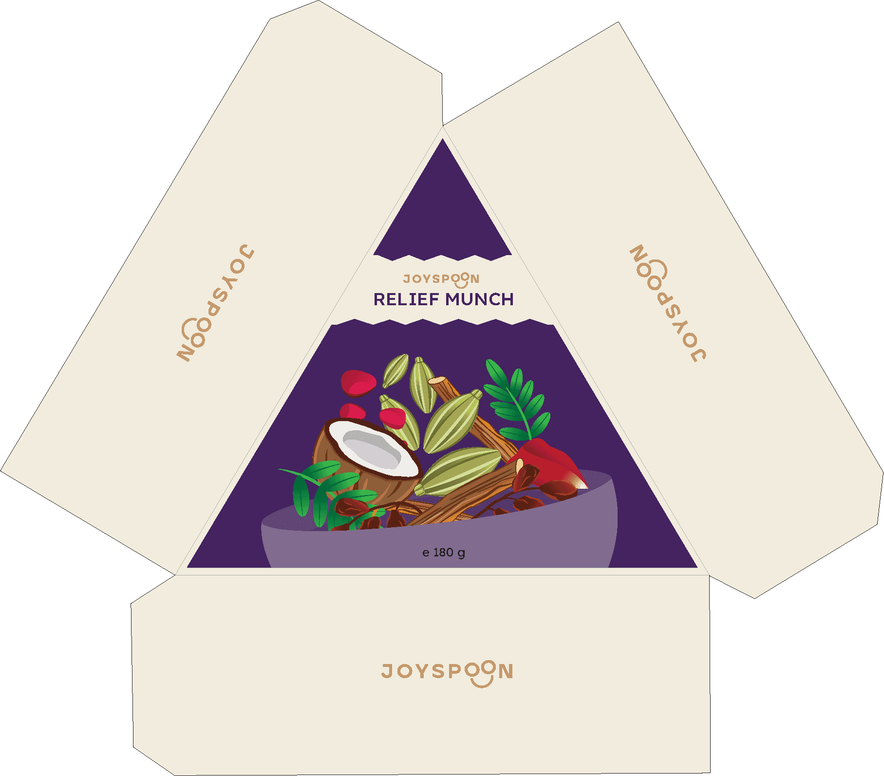This layout uses a custom dieline with an inward-folding base tray, allowing the pack to lock into itself without extra inserts. The structure keeps the form compact while still giving enough front surface for branding and product storytelling.