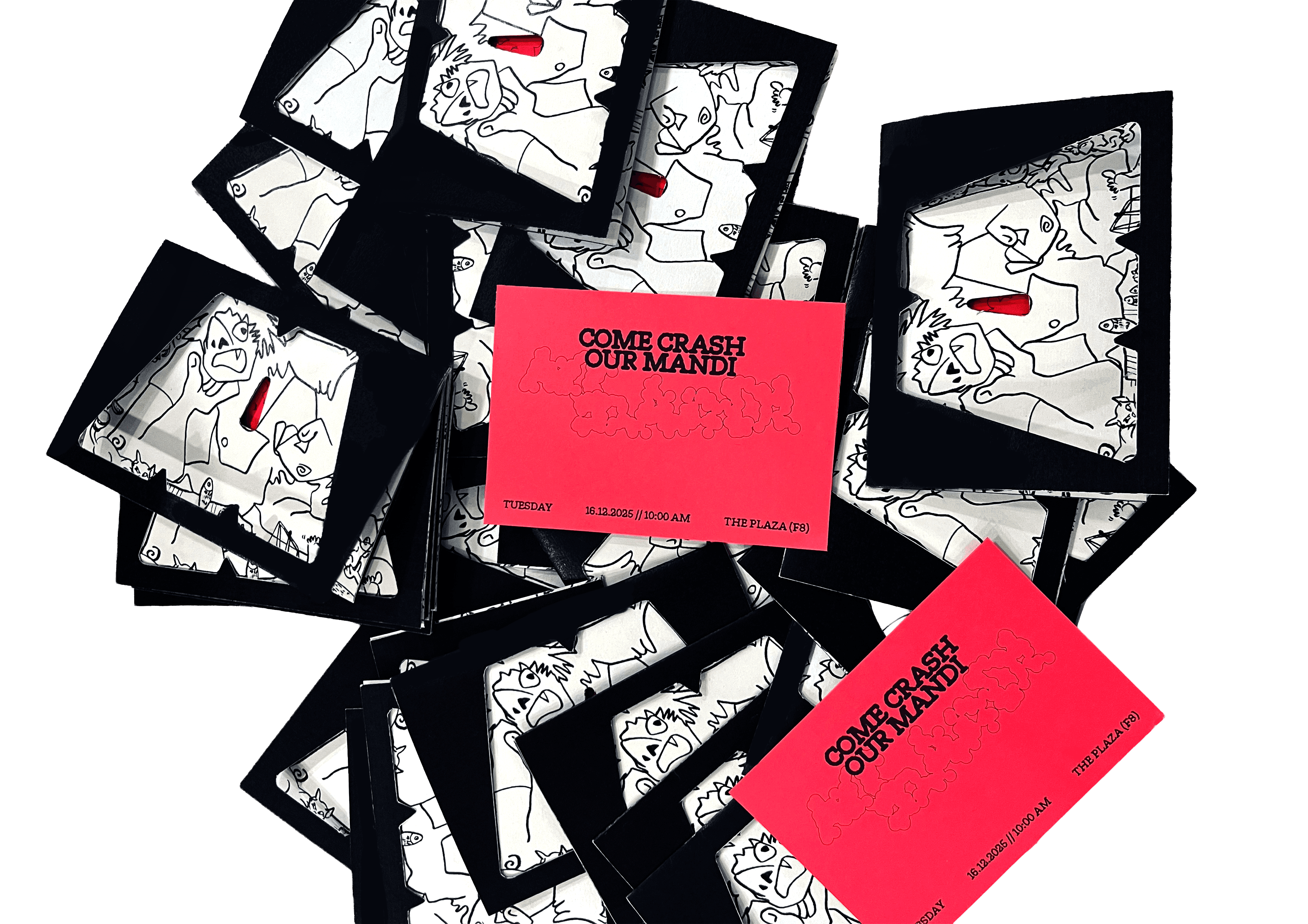 Hence, developed a die-cut invitation where the event logo became the window itself, revealing the illustration beneath. The layered reveal reinforced the underground theme, inviting interaction before it was even opened.